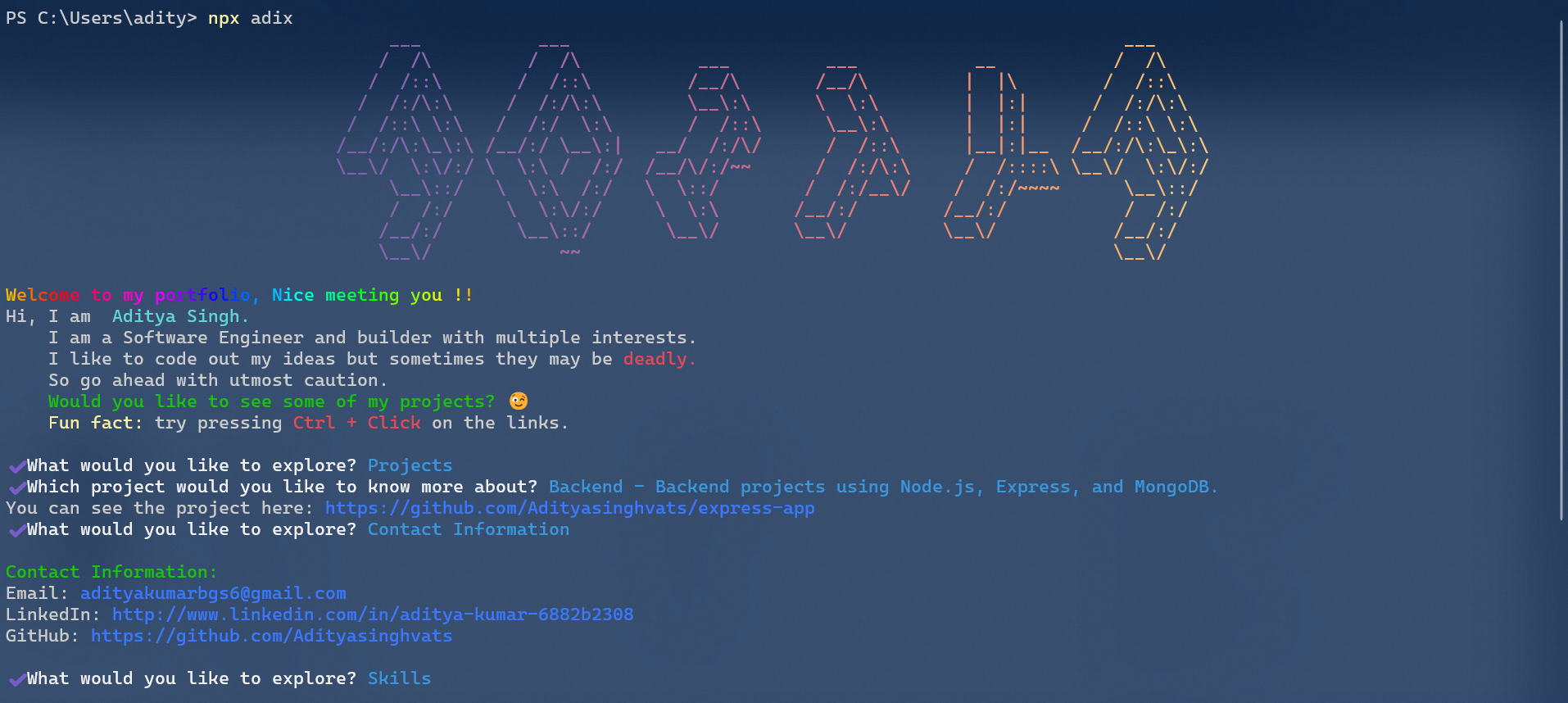 A node based CLI which shows my portfolio in your terminal with `npx adix`.
